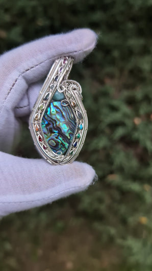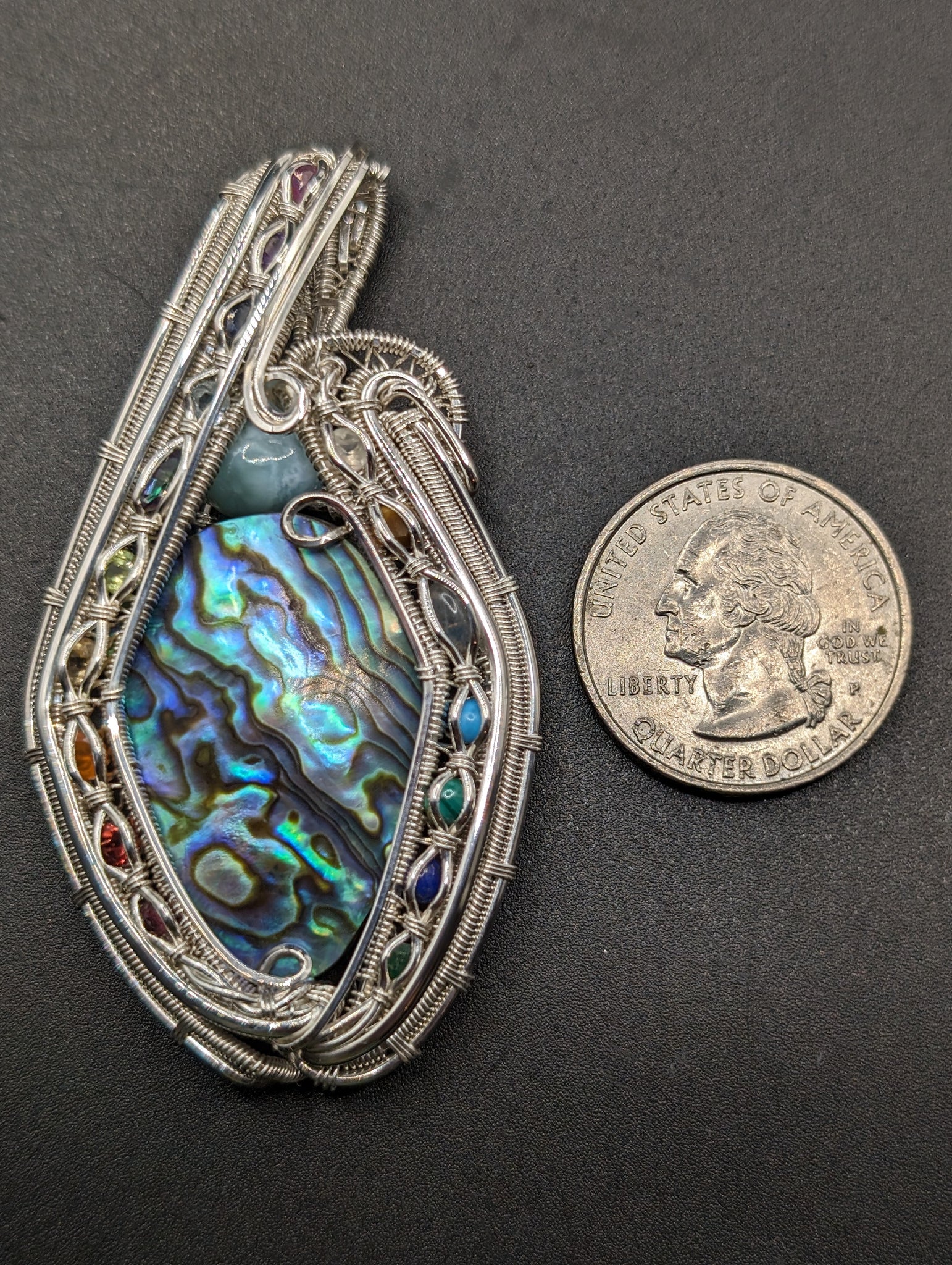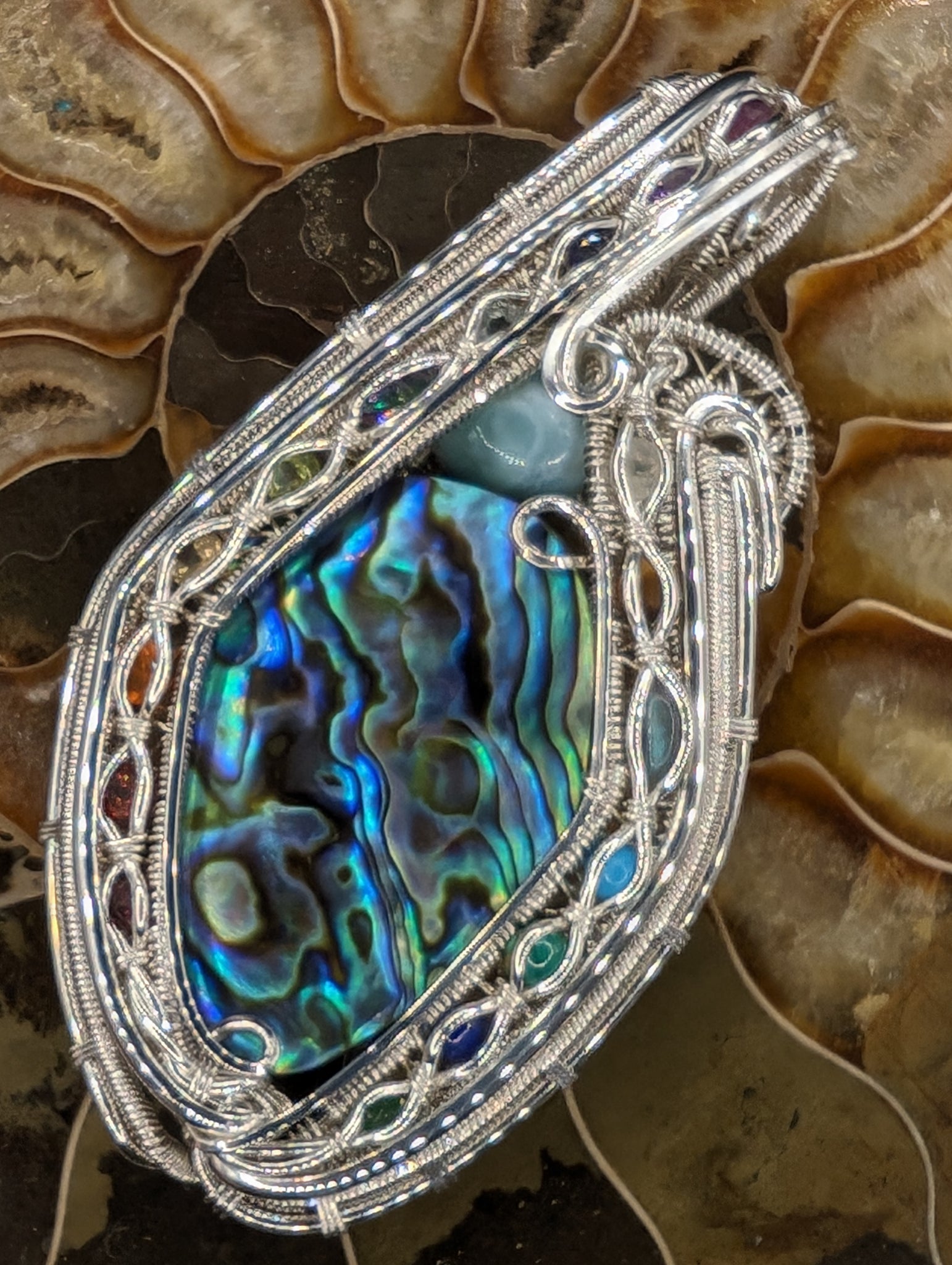 Shell topped with Larimar wrapped in sterling silver with accents in Ruby, Amethyst, Iolite, Topaz, Mystic Topaz, Peridot, Citrine, Carnelian, Garnet, Pink Tourmaline, Emerald, Lapis, Malachite, Turquoise, Labradorite, Tigereye, & Opal.