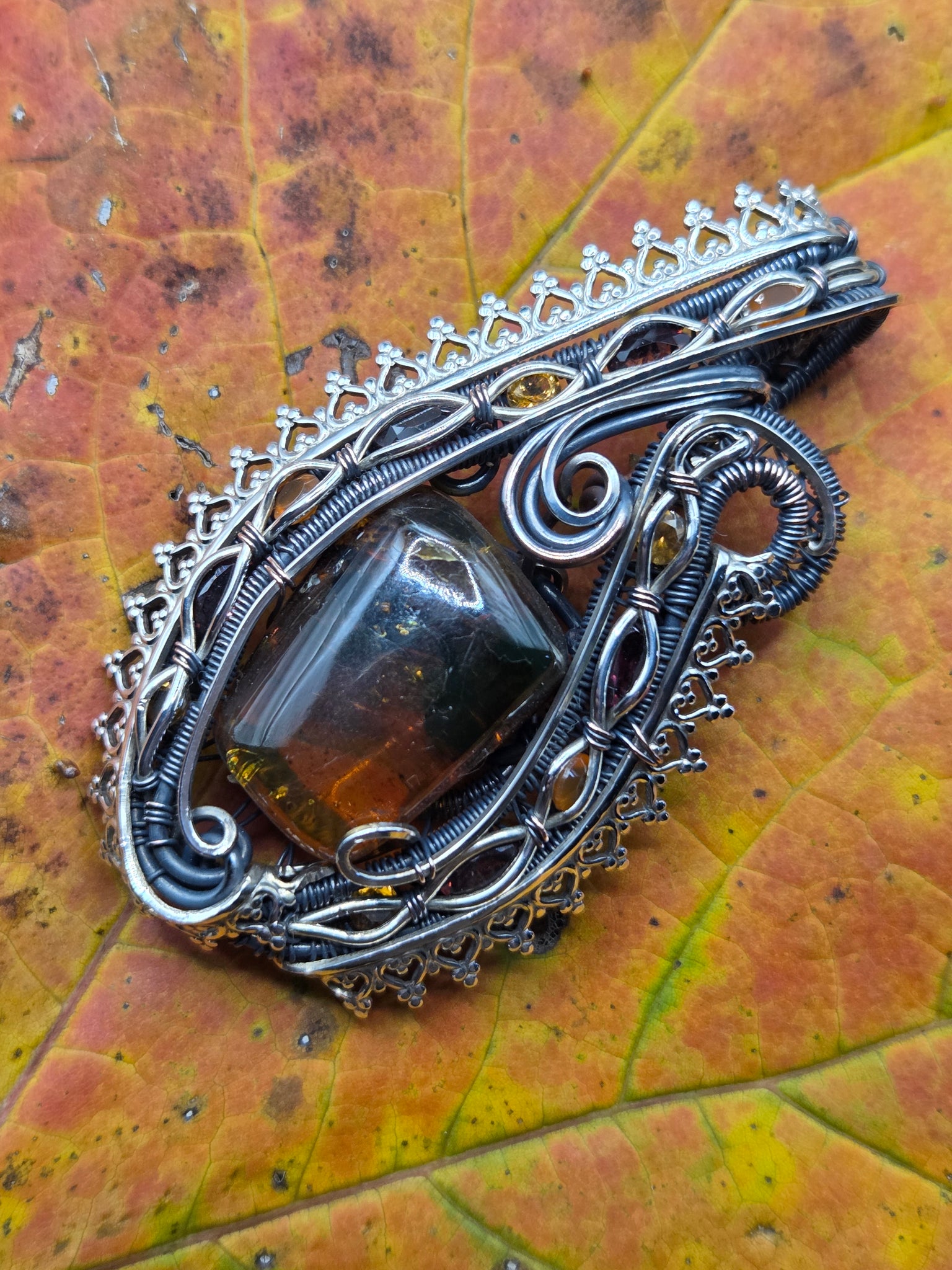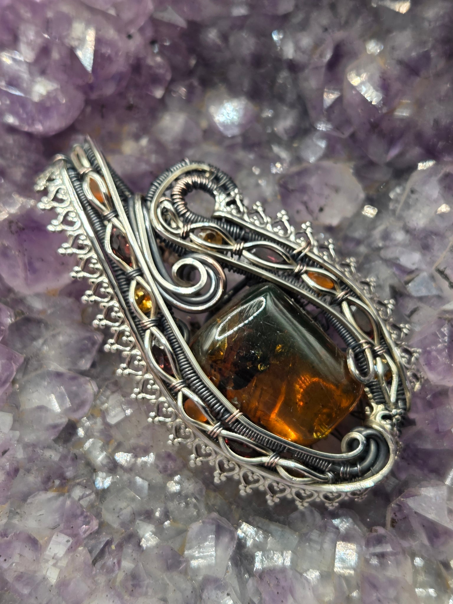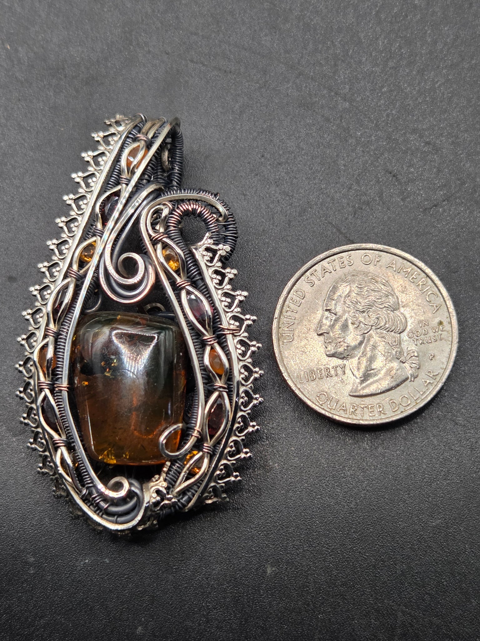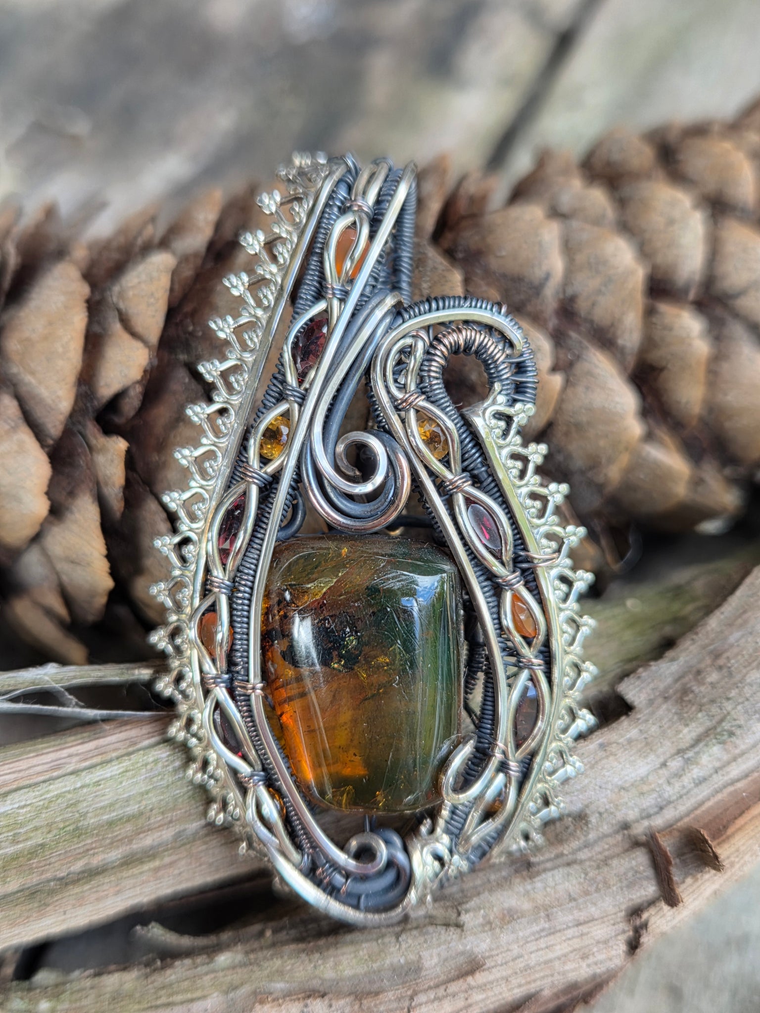 Amber wrapped in oxidized copper with sterling and argentium silver accents in Citrine, Garnet, and Carnelian 😍