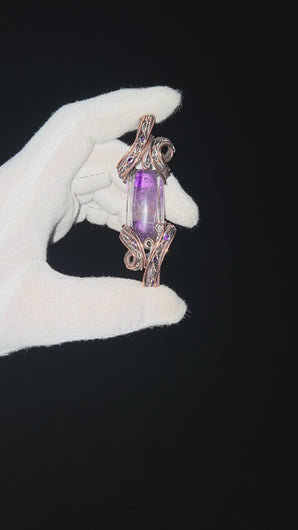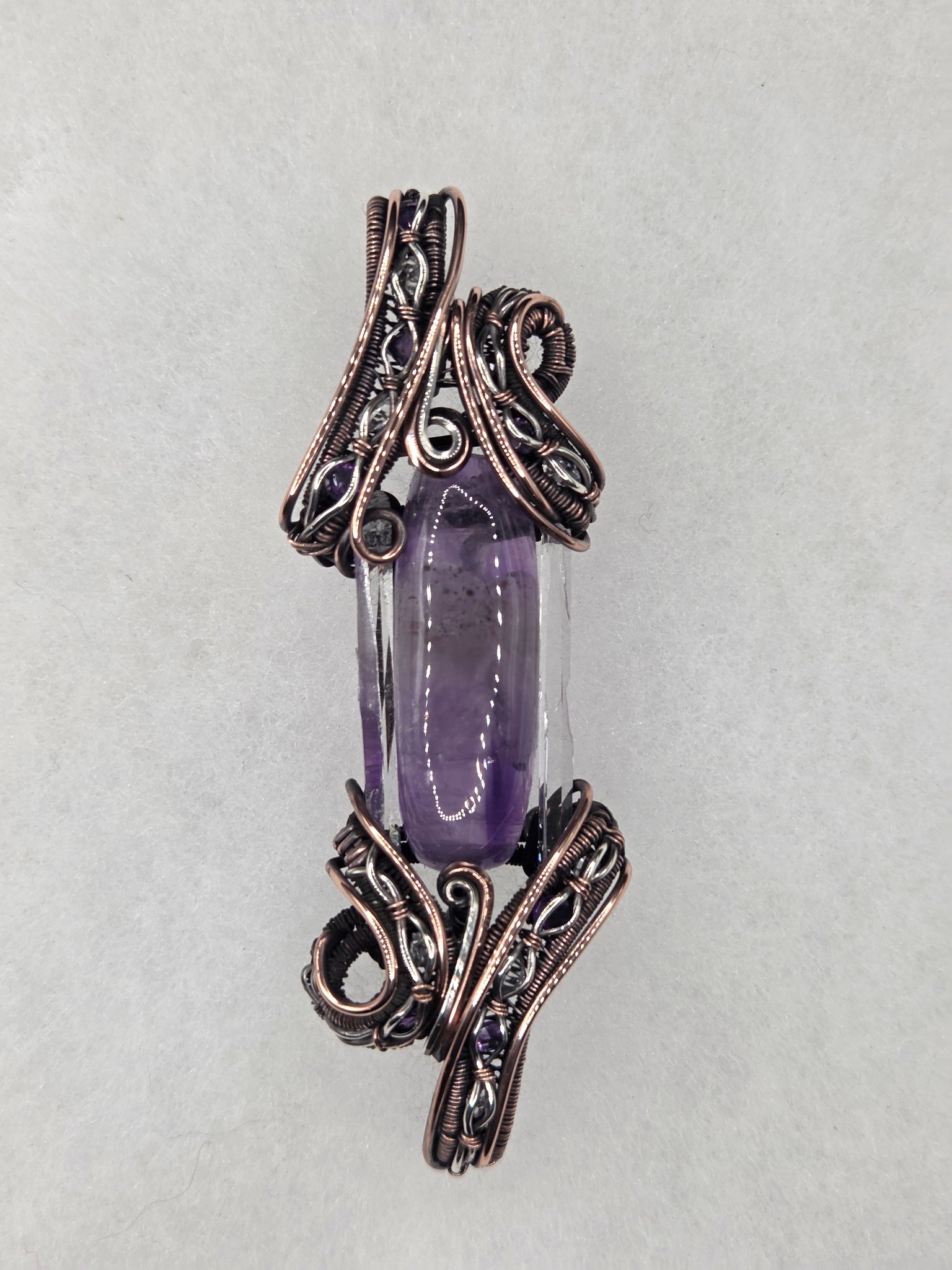 Amethyst and Quartz wrapped in oxidized copper and sterling silver with accents in Amethyst and Quartz