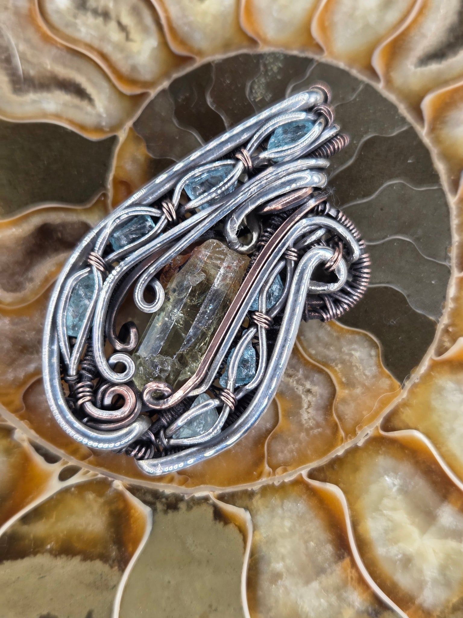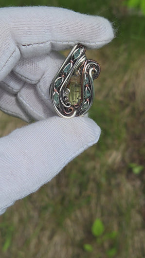 Yellow Apatite crystal wrapped in oxidized copper with Blue Apatite accents set in sterling silver