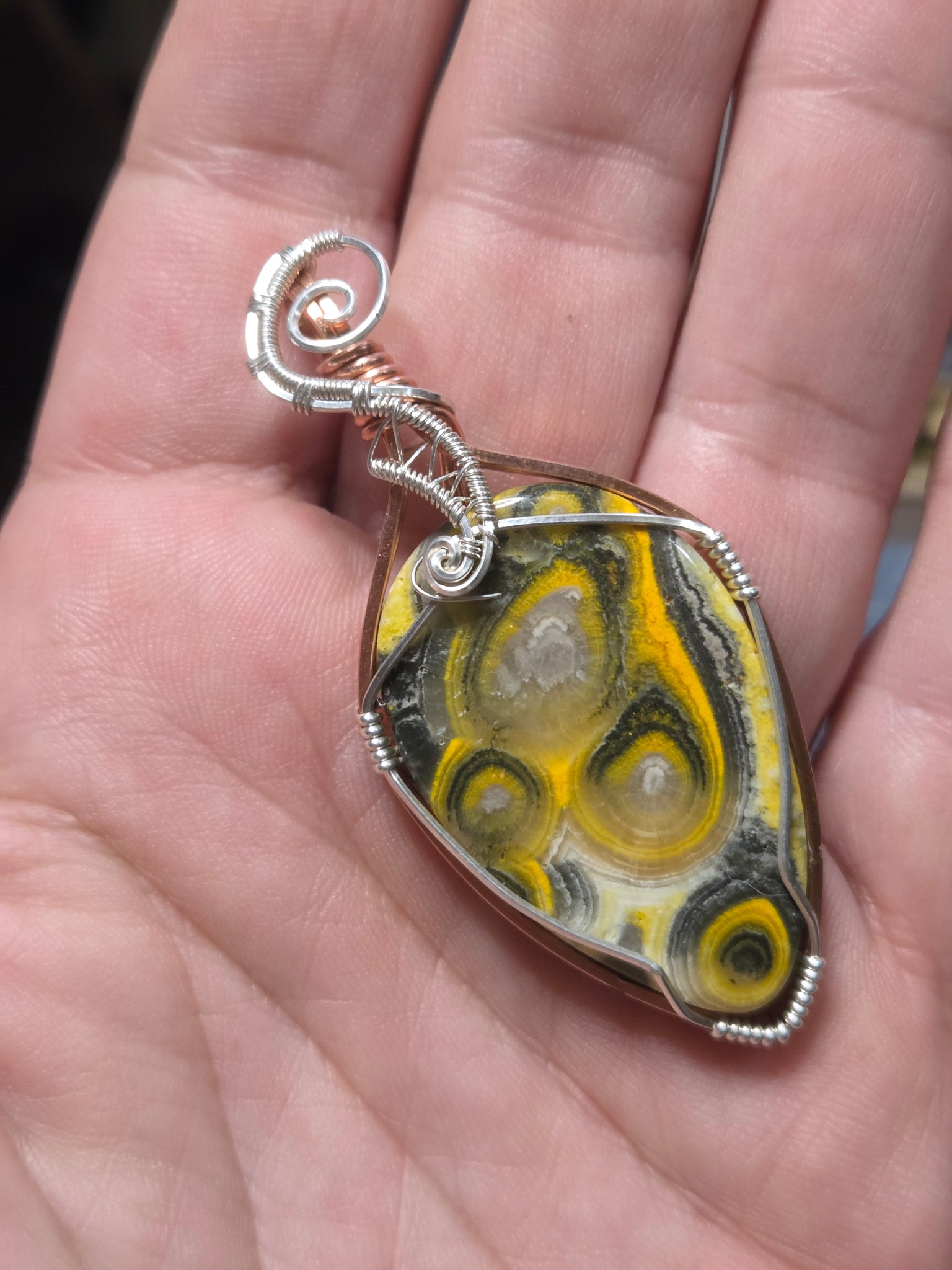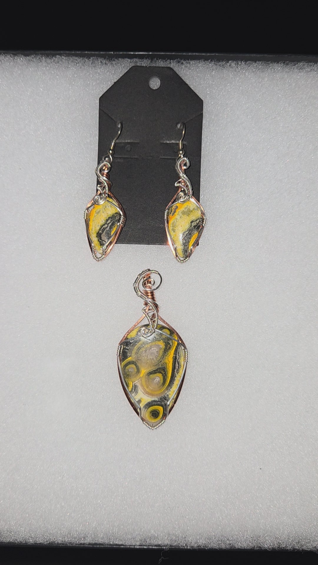 Bumblebee Jasper pendant and earrings wrapped in copper and sterling silver