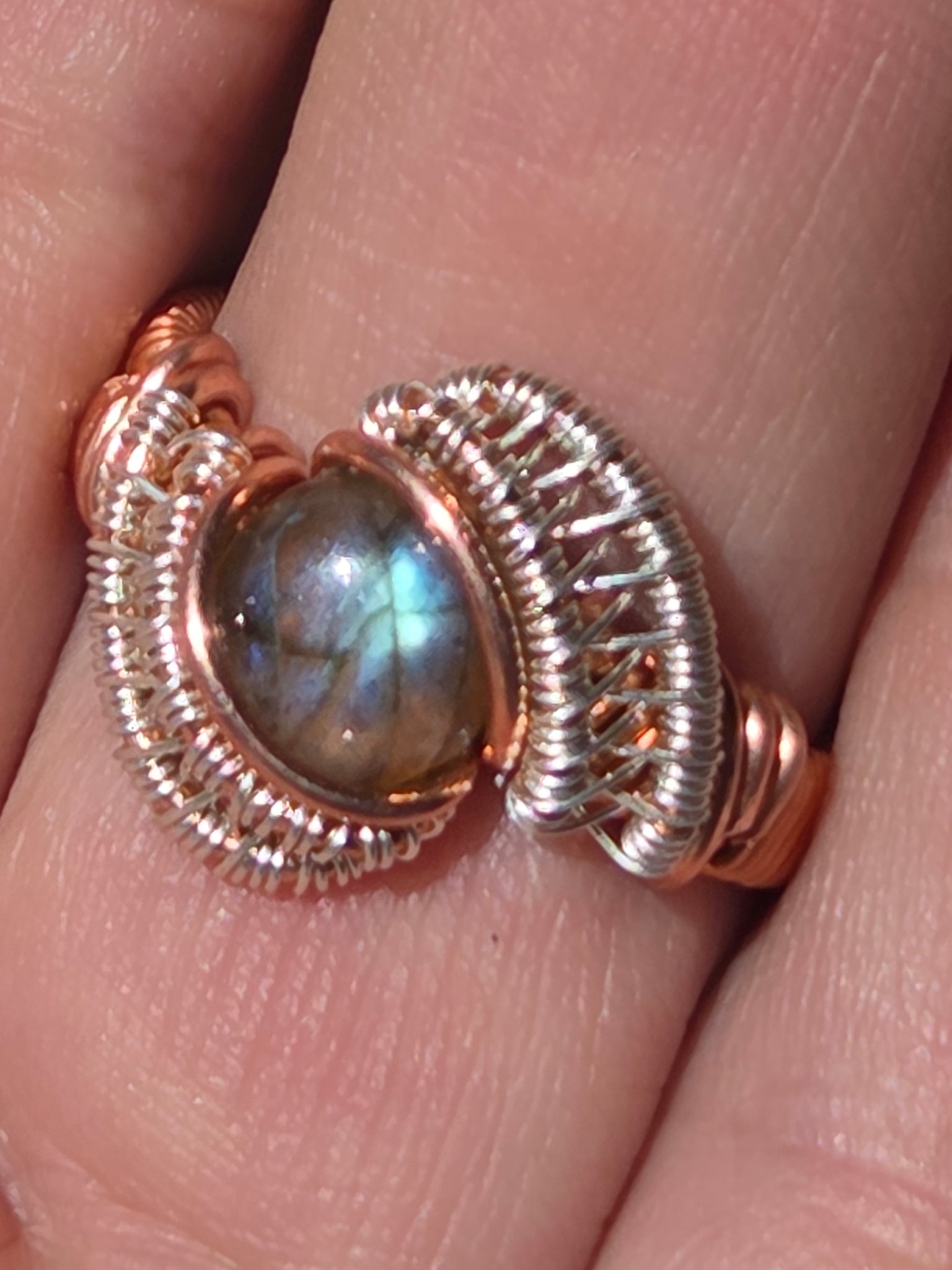 Labradorite wrapped in copper and sterling silver