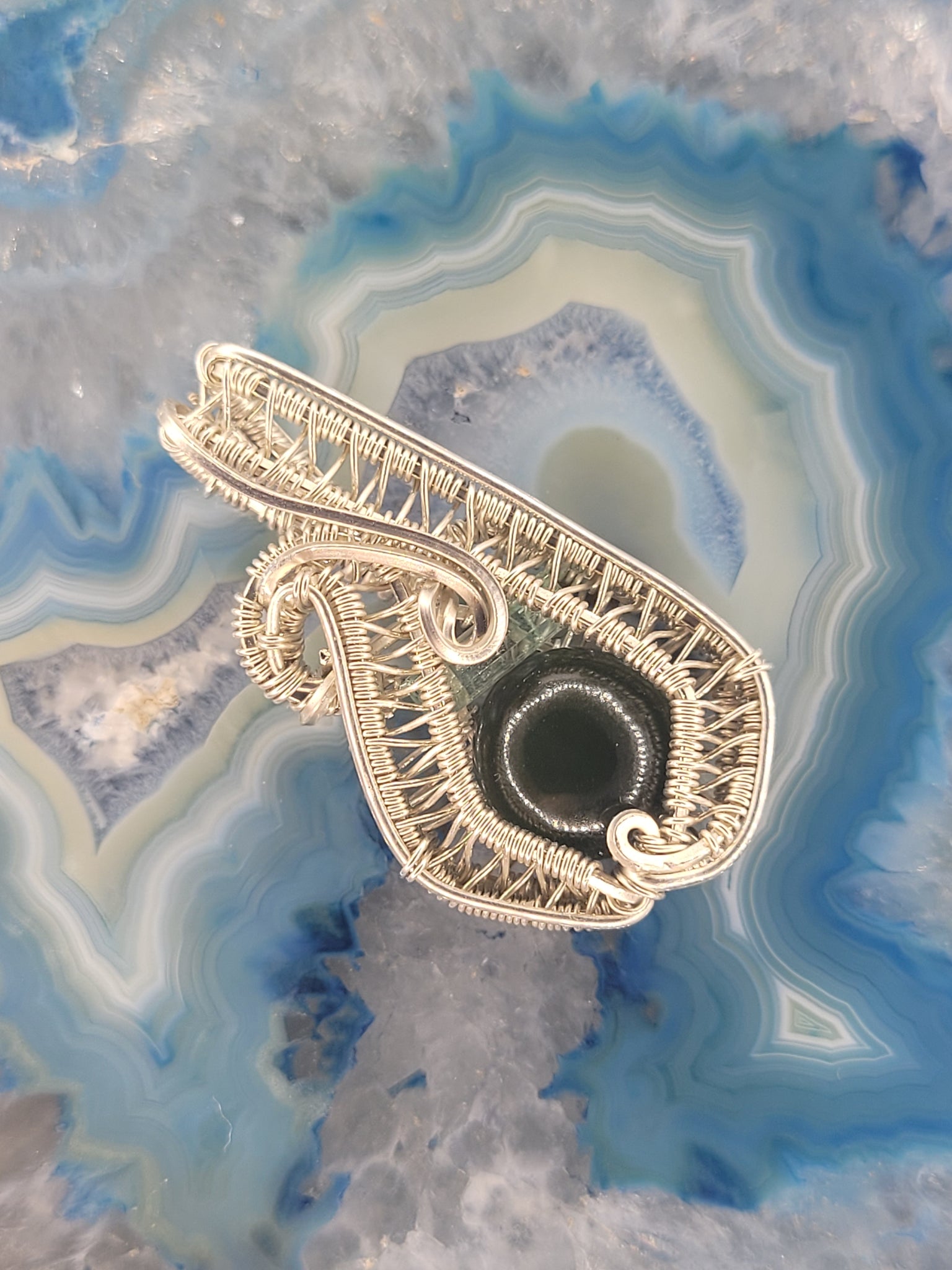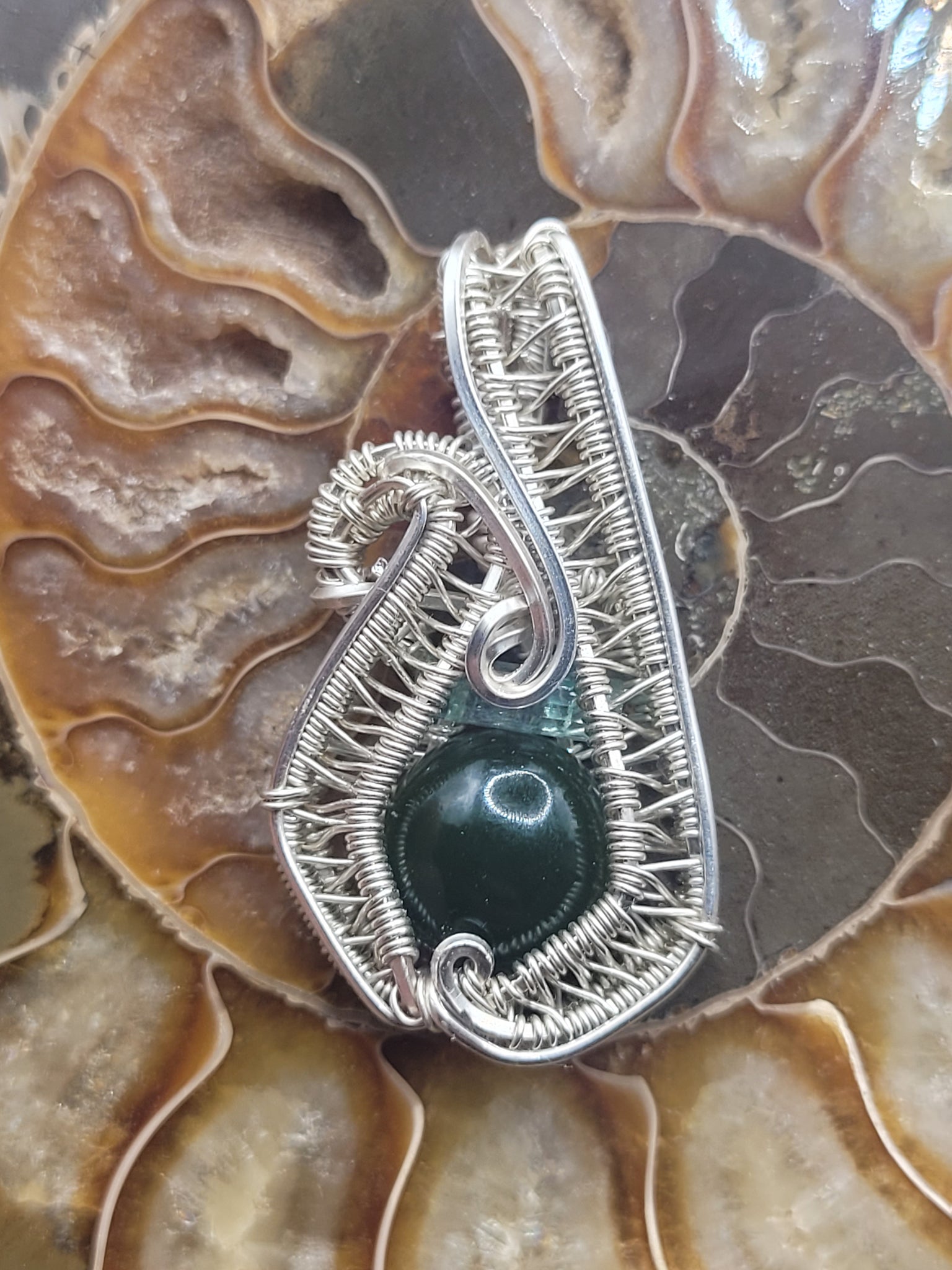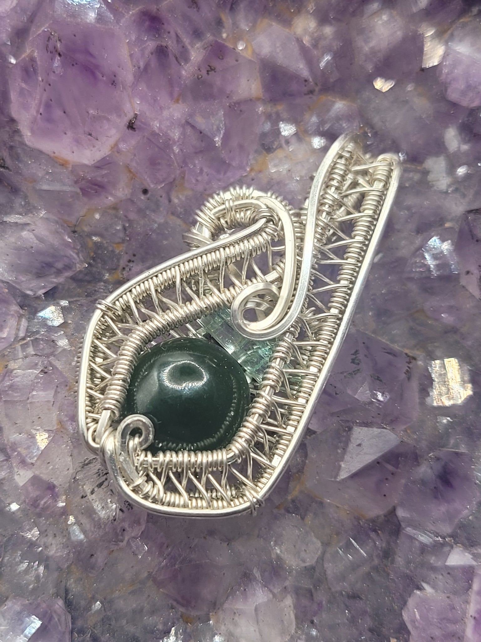 Jade cabochon topped with Emerald crystal, wrapped in .925 Sterling silver