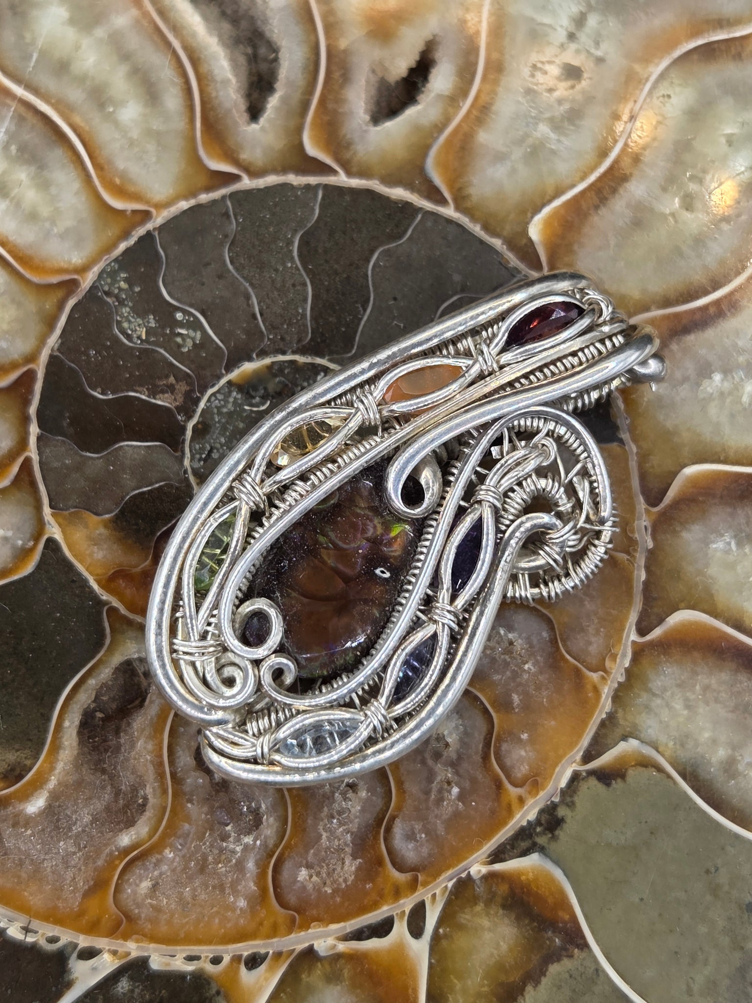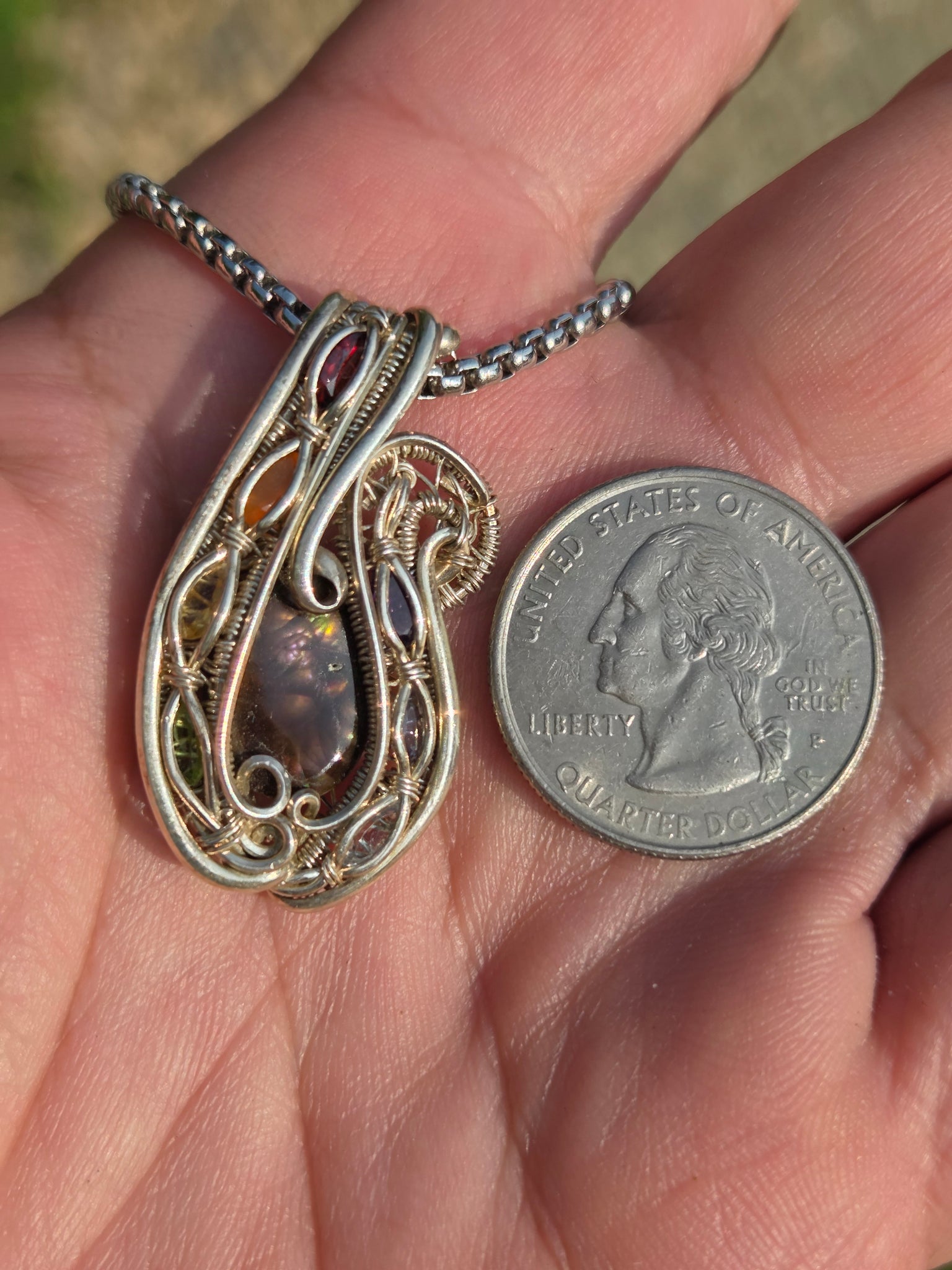 Fire Agate wrapped in sterling silver with accents in Garnet, Carnelian, Citrine, Peridot, Topaz, Iolite, and Amethyst