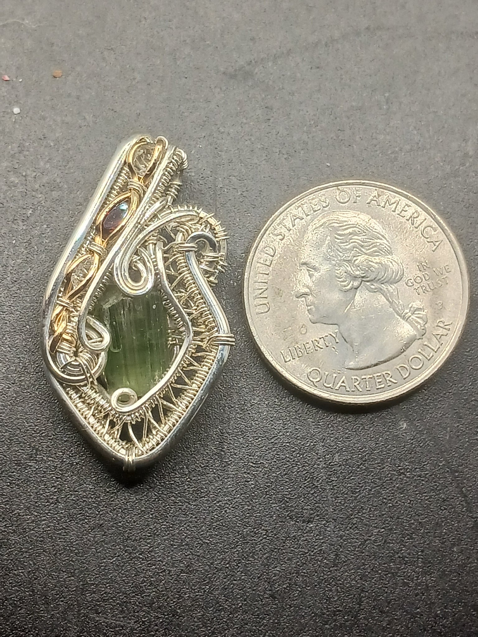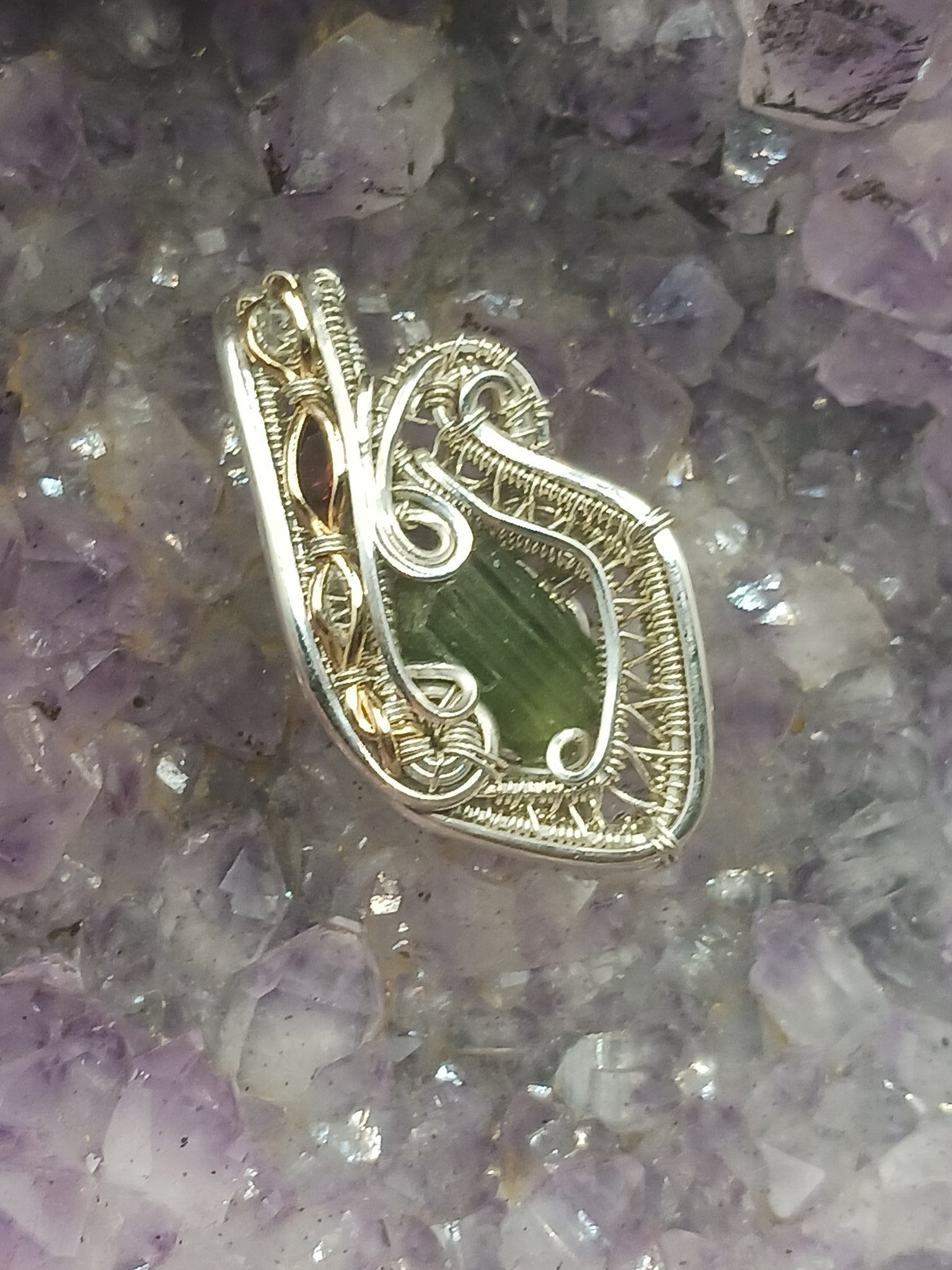 Green Tournaline crystal wrapped in sterling silver with Diamond Quartz and Garnet accents in goldfill wire