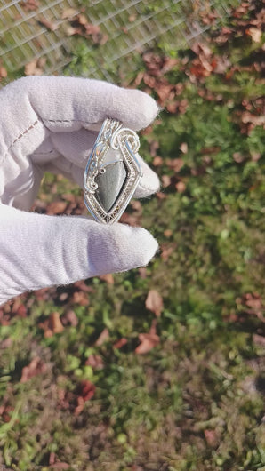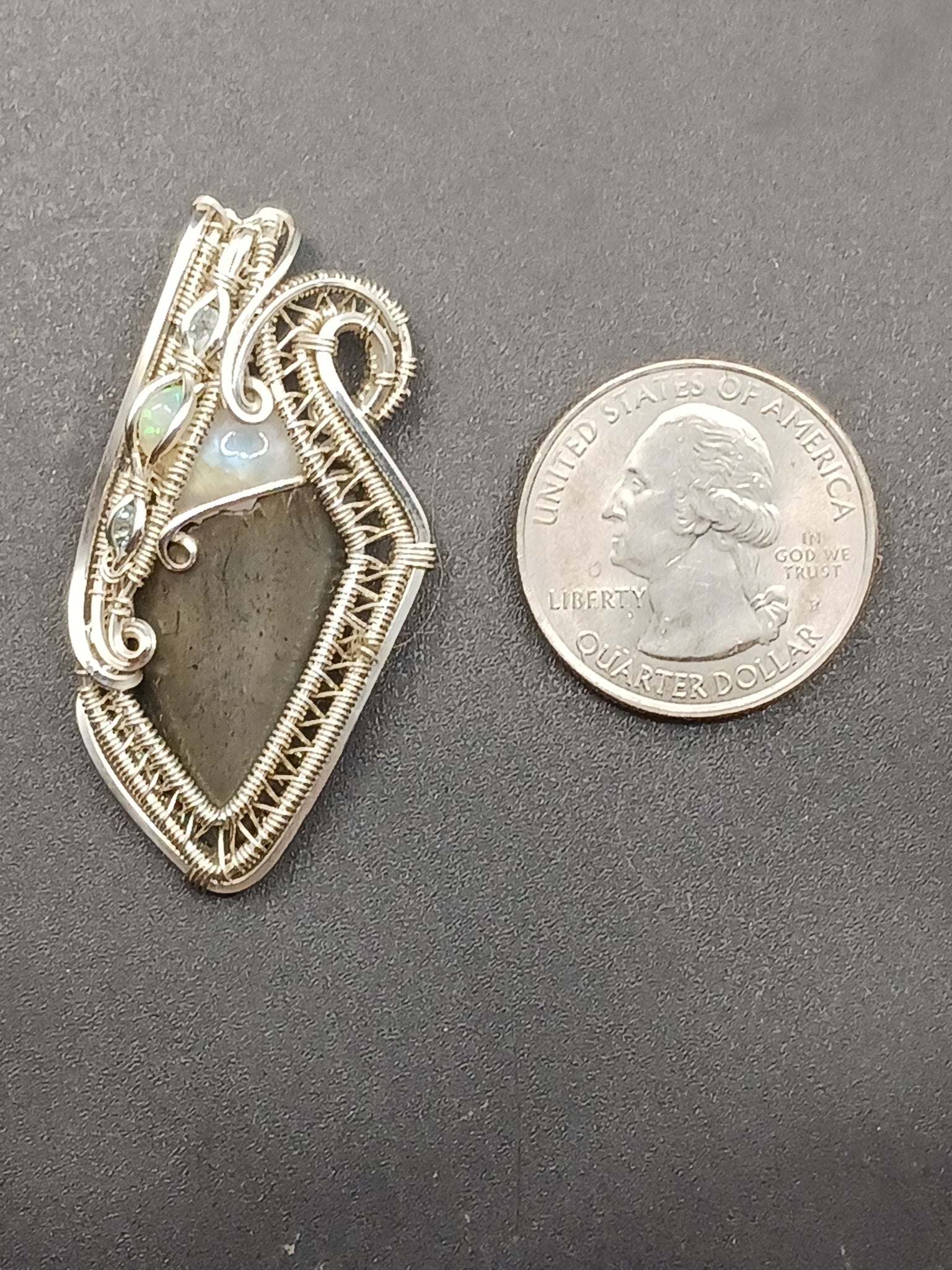Megalodon fragment topped with Moonstone cabochon with accents in Opal and 2× Topaz, wrapped in .925 sterling silver
