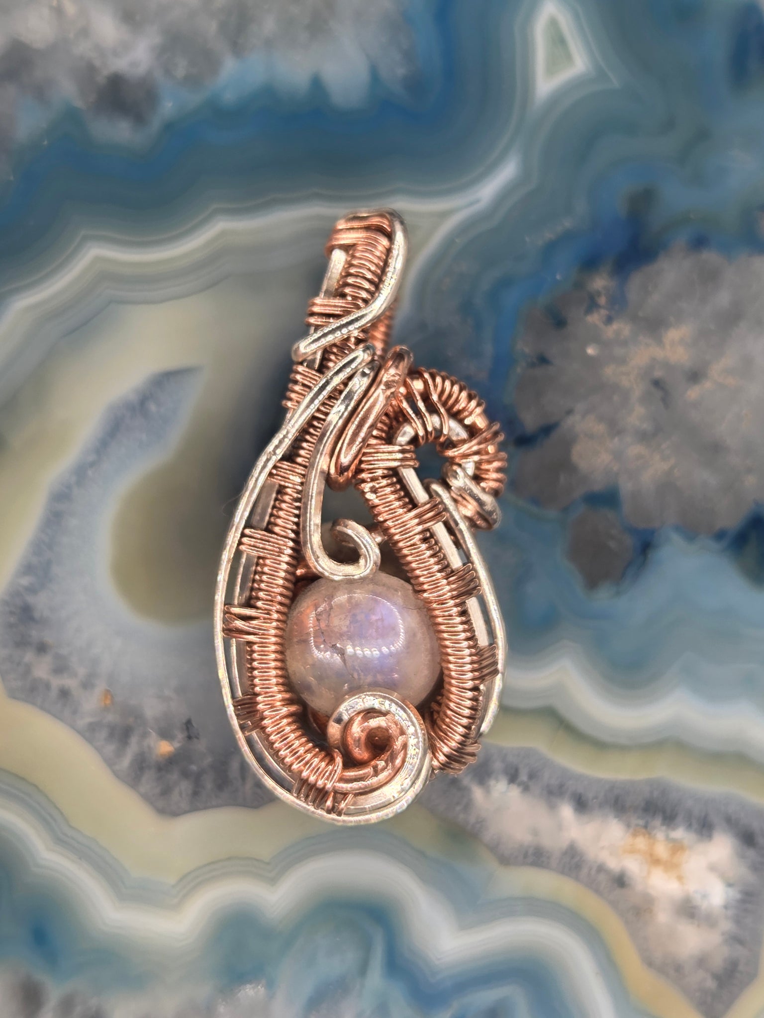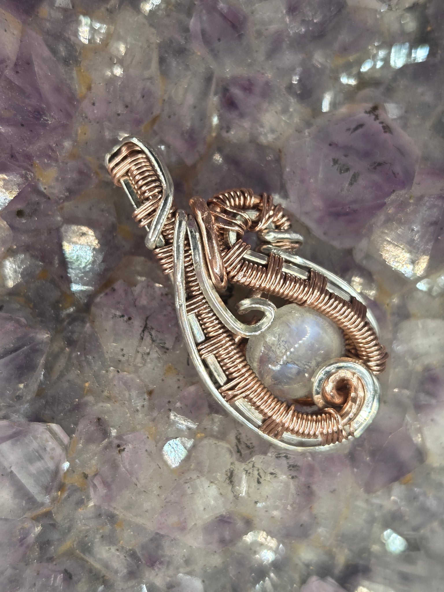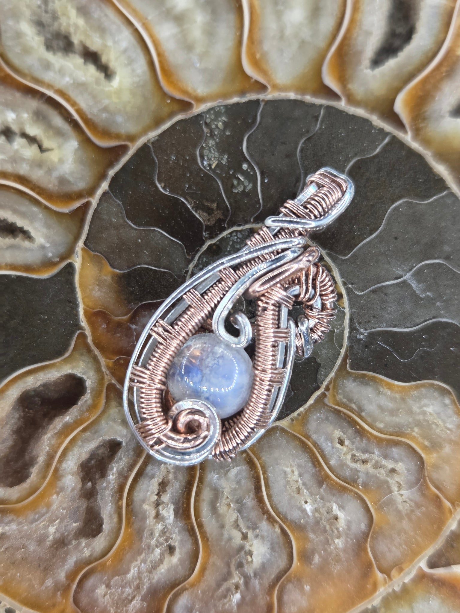 Moonstone wrapped in copper and sterling silver