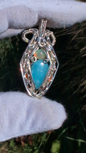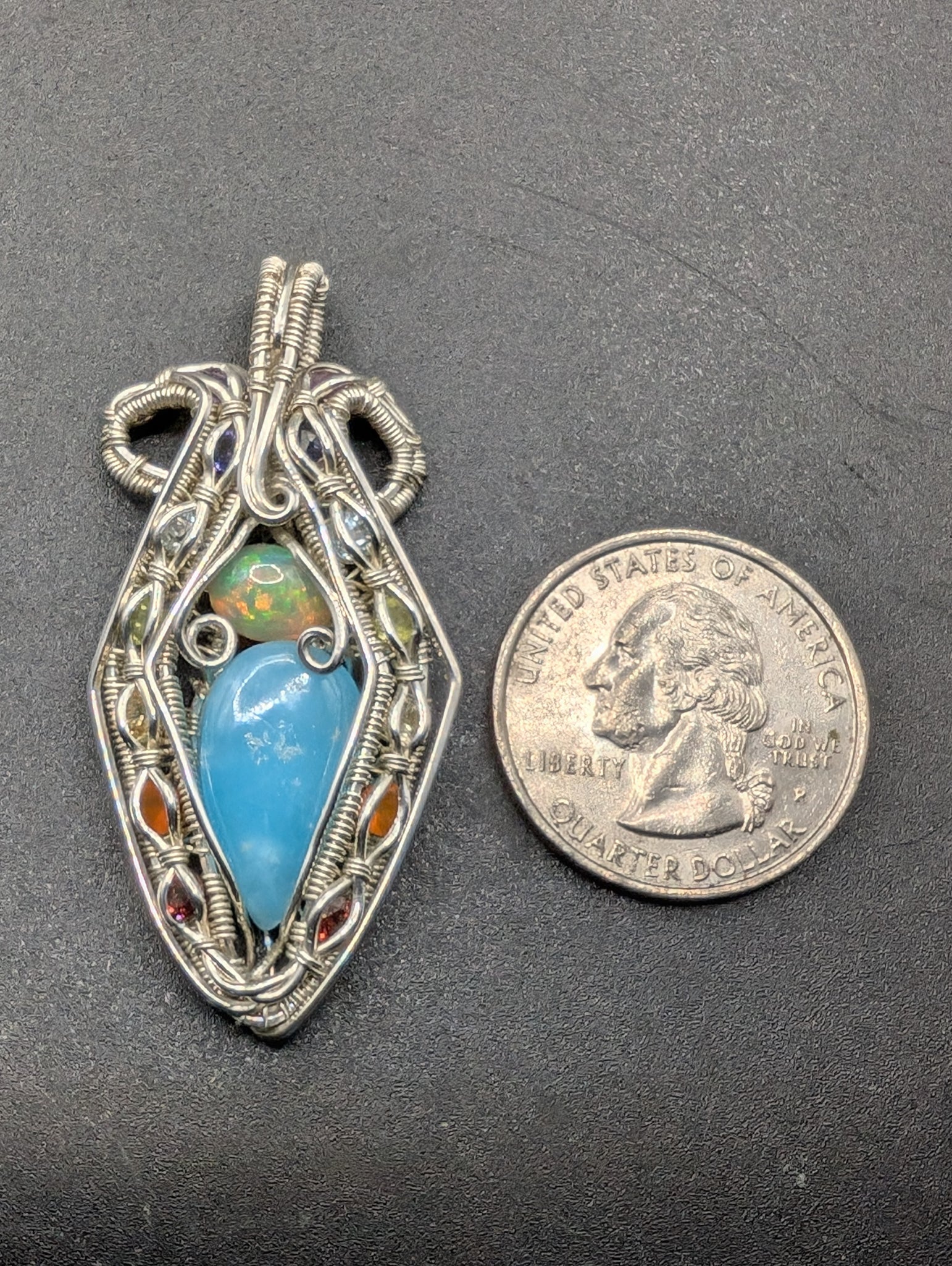 Opal and Hemimorphite centerpieces wrapped in sterling silver with accents in Amethyst, Iolite, Topaz, Peridot, Citrine, Carnelian, and Garnet