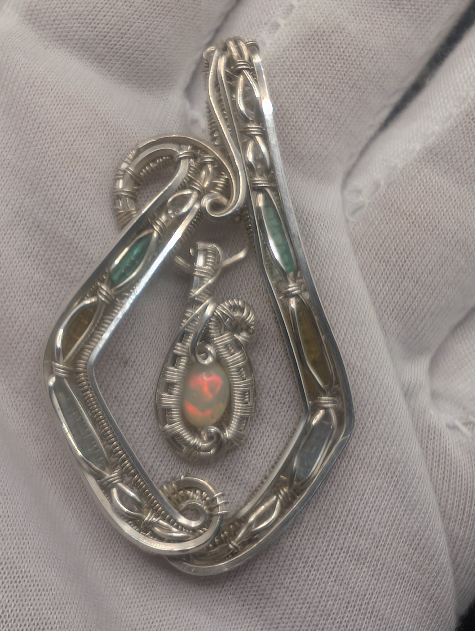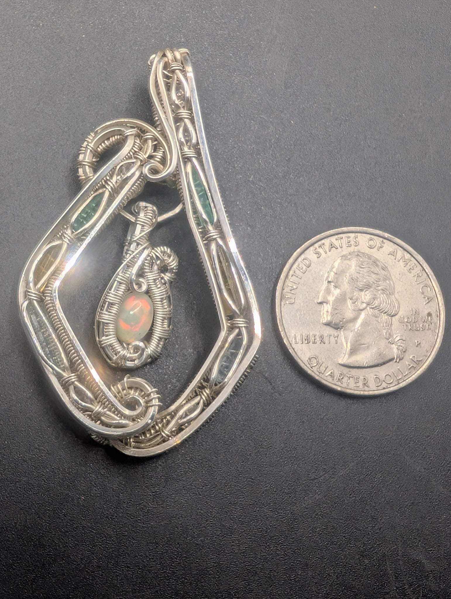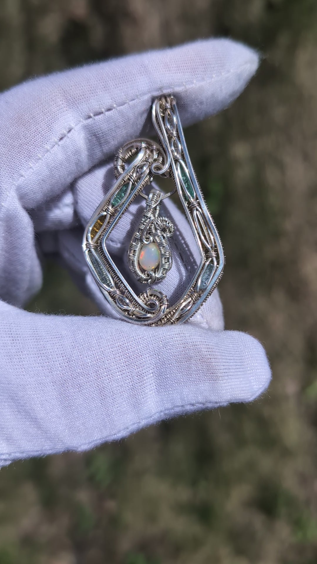 Opal pendant centerpiece wrapped in sterling silver with accents in Emerald, Aquamarine, Clinozoisite, and Quartz