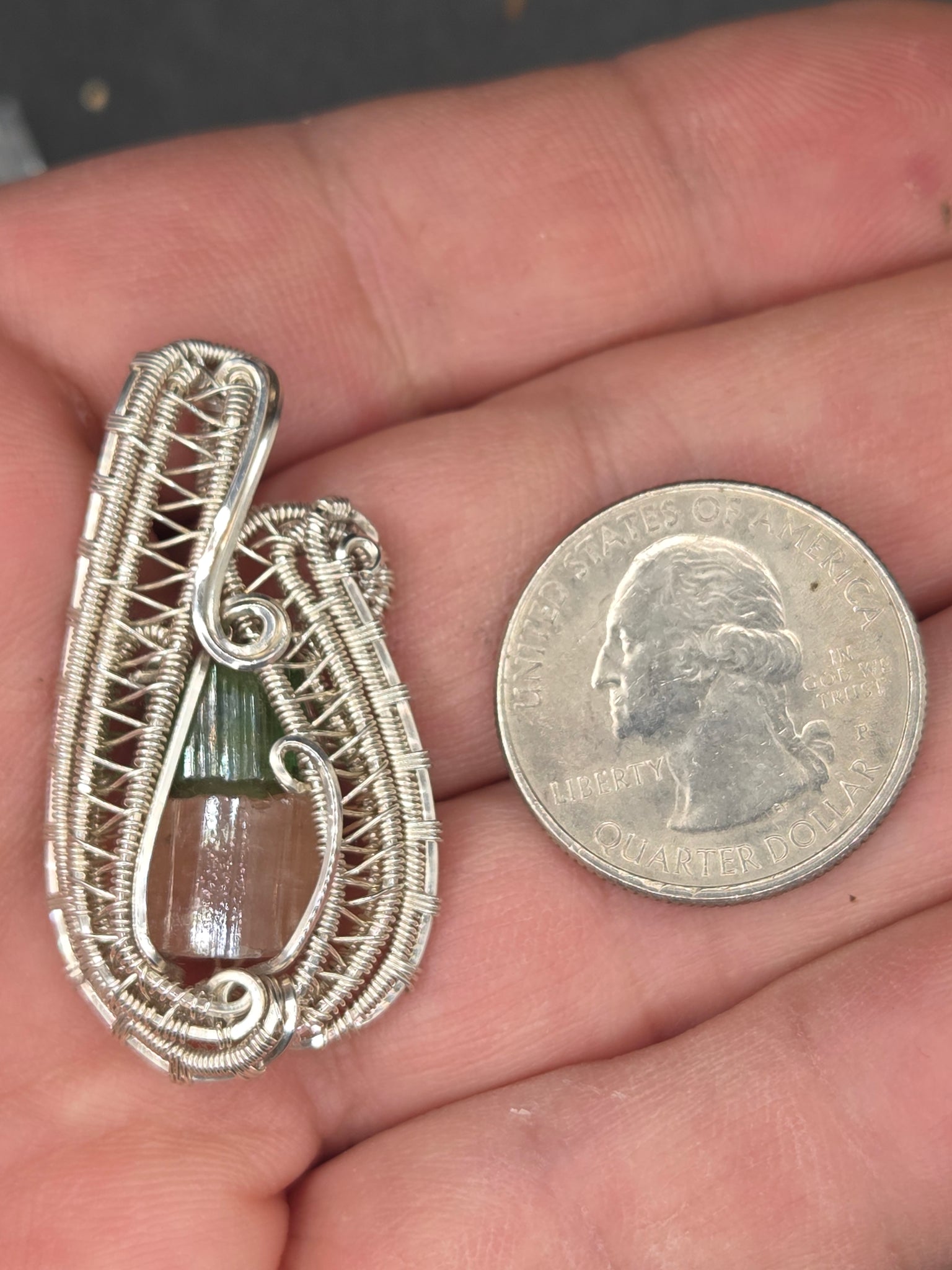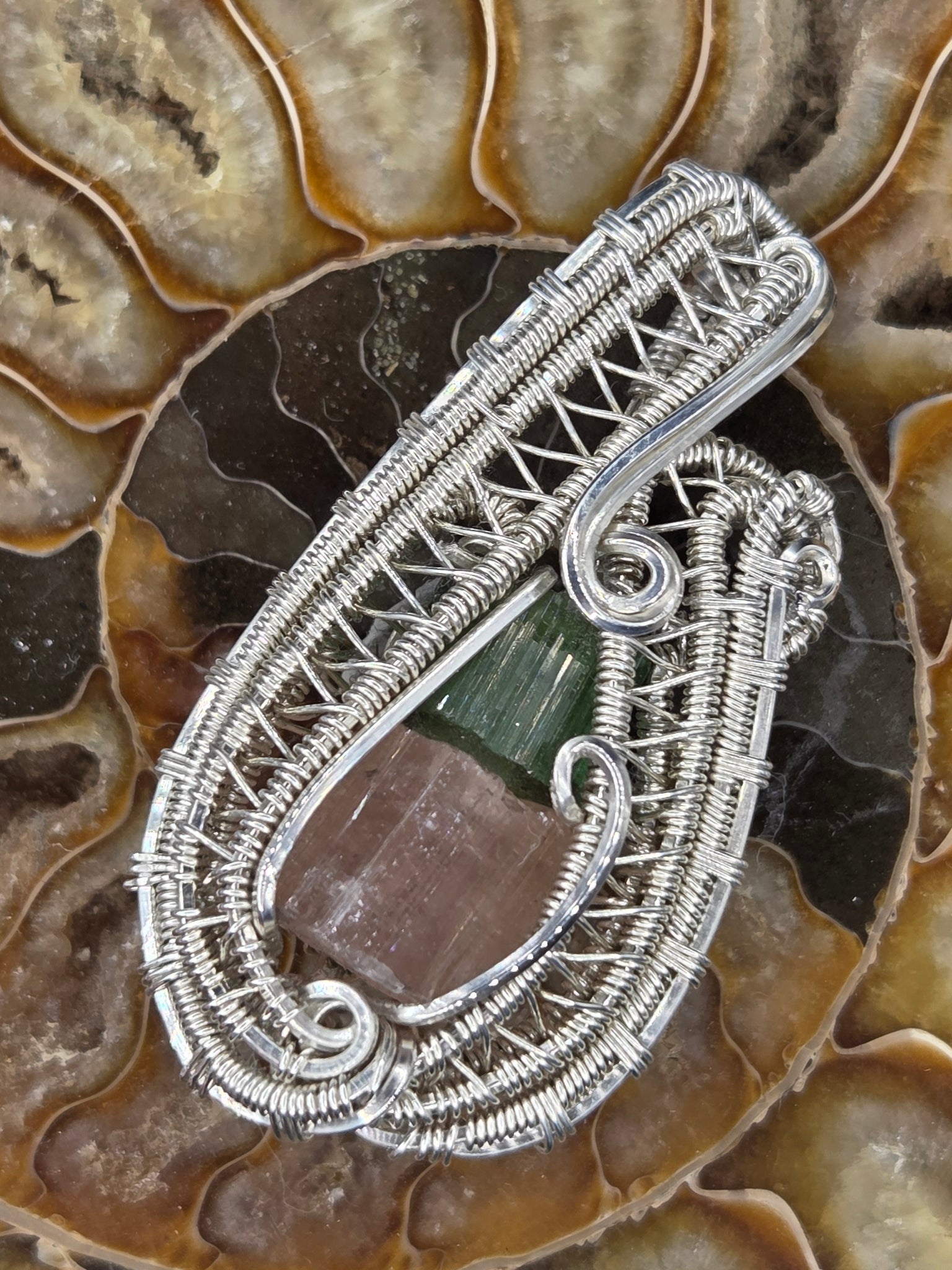 Pink and Green Tourmaline crystals wrapped in sterling silver