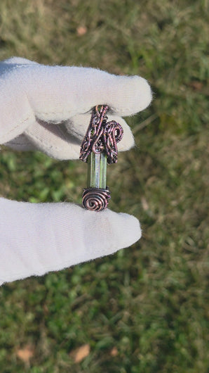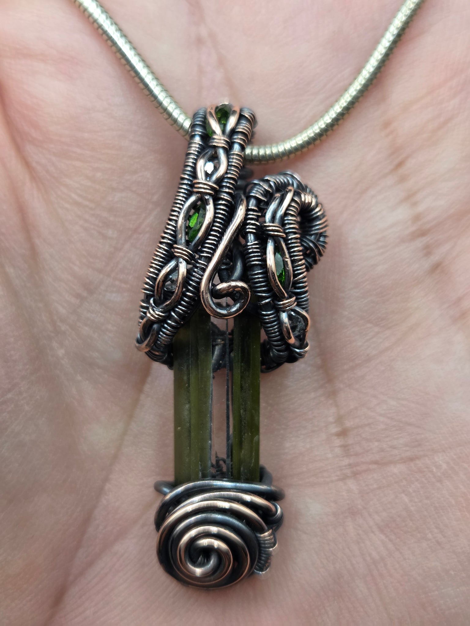 Green Tourmaline and Quartz crystal wrapped in oxidized copper with accents in Quartz and Chrome Diopside
